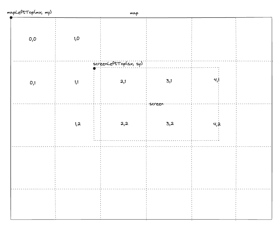 1const startPointX = Math.floor((sx - mx) / TILE_SIZE);2const startPointY = Math.floor((sy - my) / TILE_SIZE);3const lastPointX = Math.ceil((sx - mx + screenX) / TILE_SIZE) + 1;4const lastPointY = Math.ceil((sy - my + screenY) / TILE_SIZE) + 1;