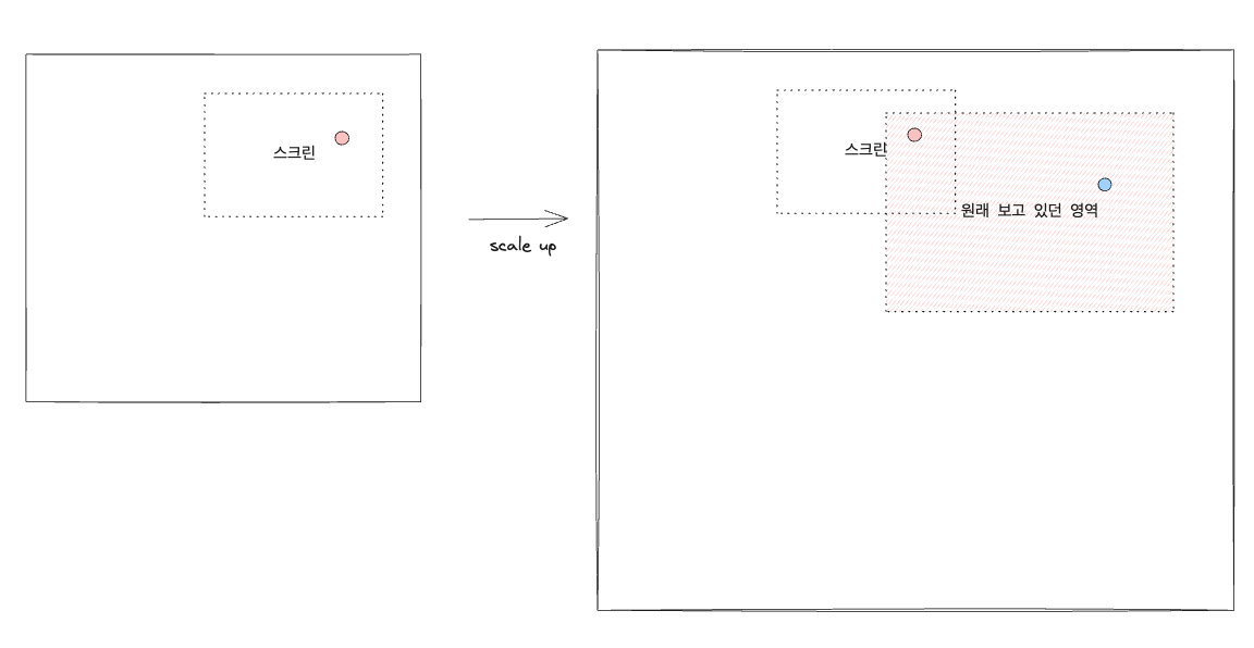 지도가 확대된 후에도 스크린 위치가 동일하다면 위 그림처럼 이전에 보고 있던 것과 다른 부분을 보게 된다. 이런 부자연스러움을 해결하기 위해서는 특정 포인트를 기준으로 확대/축소가 일어나도록 카메라 위치를 조정해줘야 한다.